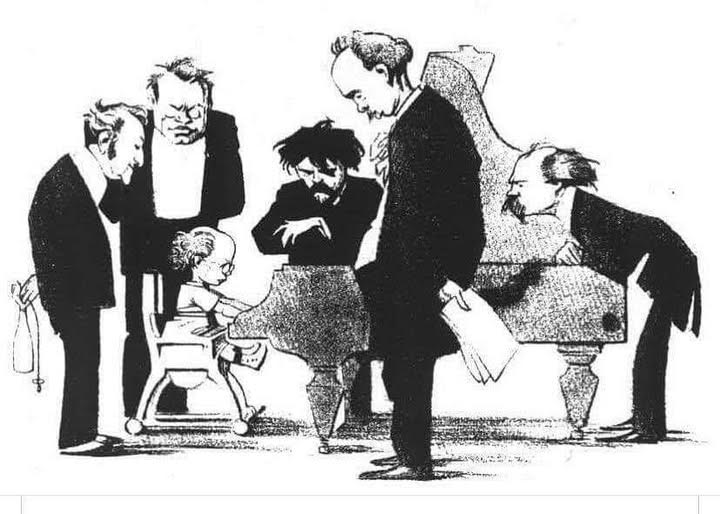 ひとつめは、少年コルンゴルトの作品を聴いたマーラーが、彼を「音楽的天才」と評し、ツェムリンスキーに師事することを勧めたと伝えられる話です。その逸話を象徴するような史料として、1911年、Neues Wiener Tagblatt(新ウィーン日刊紙)に掲載されたカリカチュアとされる画像があります。